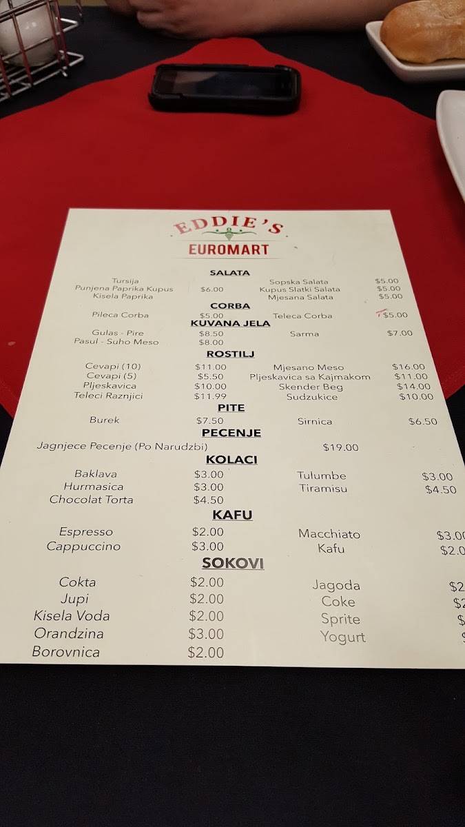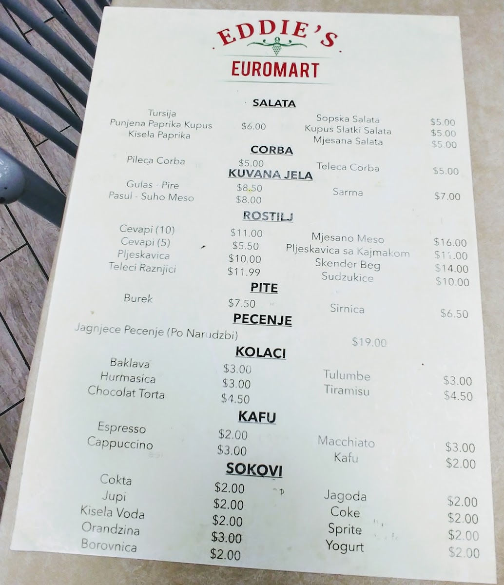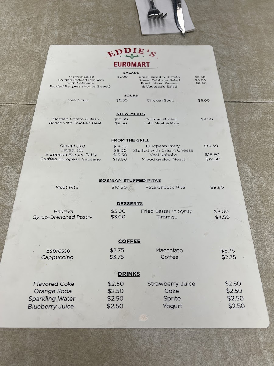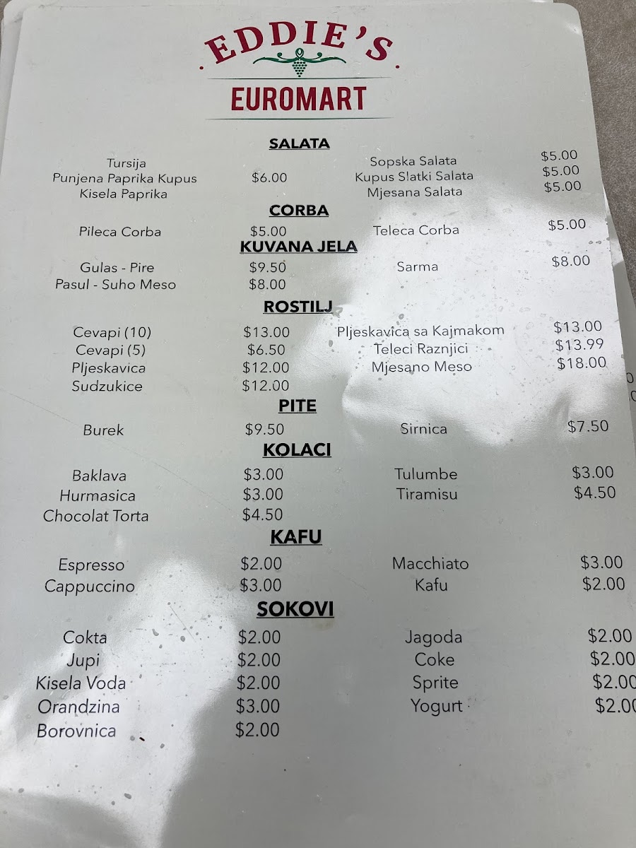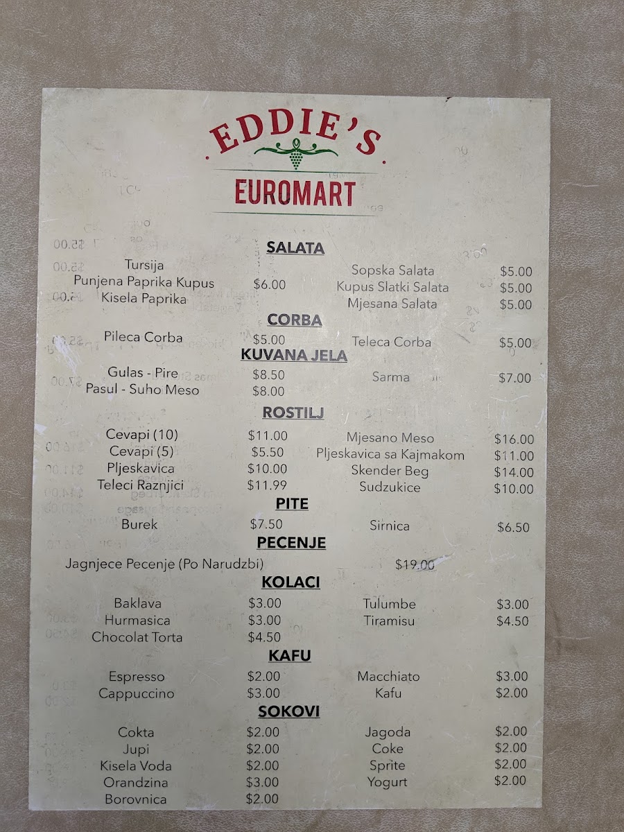 Eddie's Euromart in Dallas offers a diverse and flavorful menu that captures the essence of European cuisine. Starting with their soups like the hearty Pileca Corba (Veal Soup) and the lighter, yet comforting Teleca Corba (Chicken Soup), there’s something to satisfy every taste. The drinks menu provides refreshing choices such as Spezi (Cola and Orange Mix), Kisela Voda (Sparkling Water), and Jagoda (Strawberry Yogurt Juice), along with Orandzina (Pulp Orange Soda), ensuring that you have plenty of options to complement your meal.